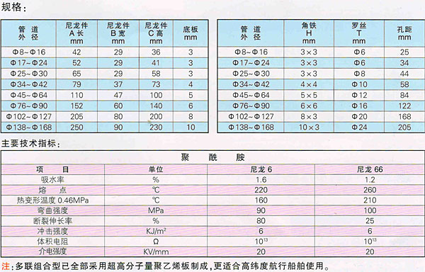 第一代尼龙管夹产品主要材料为聚丙烯及聚酰胺(尼龙6、尼龙66),上下夹板采用优质镀锌钢板,304、316不锈钢板。本产品一般为黑色,也可根据用户选择色泽。
