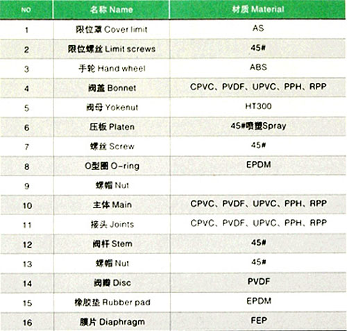 承插隔膜阀零件材质表
